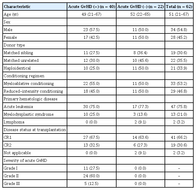 This study was conducted from 2019 to 2024 and included adult patients (19 years or older) who underwent allogeneic SCT at Ajou University Medical Center for hematologic malignancies. Among the 154 patients who underwent allogeneic hematopoietic SCT during the study period, 40 patients diagnosed with acute GvHD were included in this study. The 22 patients in the control group who did not develop acute GvHD were selected based on matched clinical characteristics with the acute GvHD group to ensure comparability between the two groups. All Patients received peripheral blood stem cell transplants from matched sibling, matched unrelated, or haploidentical donors. For matched donor transplantation, the GvHD prophylaxis regimen consisted of a calcineurin inhibitor plus methotrexate and anti-thymocyte globulin [14]. For haploidentical donor transplantation, a calcineurin inhibitor and mycophenolate mofetil were administered in combination with post-transplant cyclophosphamide [15]. The severity of acute GvHD was assessed according to the Mount Sinai Acute GvHD International Consortium (MAGIC) criteria [16]. Detailed characteristics of 62 enrolled patients are described in Table 1. The study was approved by the Institutional Review Board of Ajou University Hospital (IRB number. AJOUIRB-OBS-2021-484), and all participants provided written informed consent. Additionally, all experimental procedures involving patient-derived specimens were conducted in accordance with the approved IRB protocol.