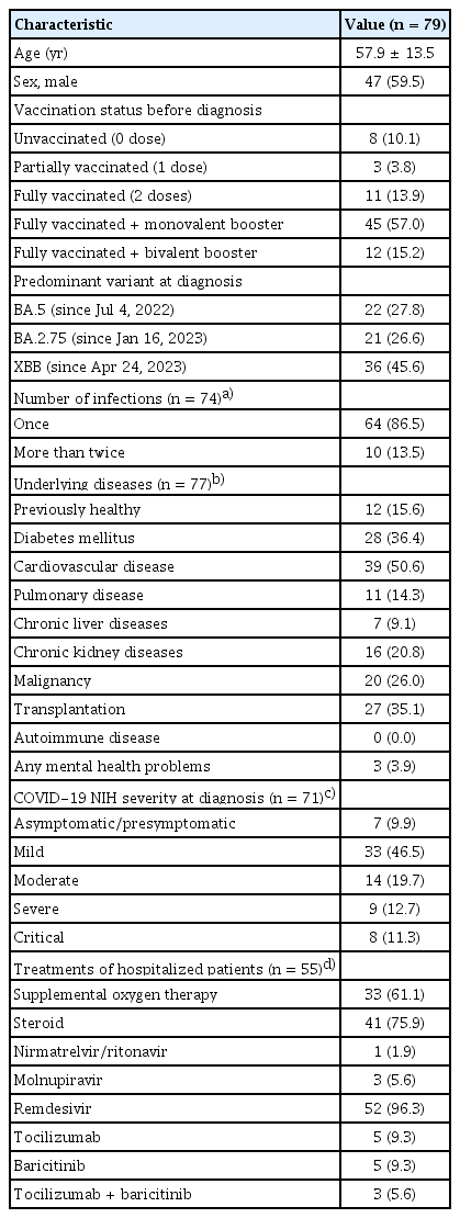 A total of 156 blood samples and symptom reports from 79 participants were eligible for analysis. The baseline characteristics of participants are as follows (Table 1). The mean age was 57.9 years, and approximately 60% of participants were male. Most participants (86.1%) completed a 2-dose vaccination with the adenovirus-vectored vaccine or mRNA vaccines; 72.2% of these participants had received booster shots. Additionally, 15.6% of all participants had been previously healthy, and approximately half of the participants experienced mild COVID-19. The treatments that hospitalized individuals received are summarized in Table 1. Of this cohort, 41 individuals (51.9%) met criteria for PASC and 38 (48.1%) were categorized as non-PASC (Supplementary Table 1). PASC group showed a higher proportion of individuals with multiple infections (more than twice) (p = 0.097), chronic liver diseases (p = 0.051), and use of tocilizumab (p = 0.019).