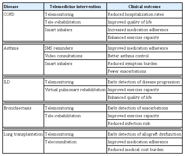 Telemedicine has emerged as a pivotal tool in the management of chronic lung disease, allowing remote monitoring, early detection of disease progression, and timely therapeutic interventions. In COPD, ILD, asthma, and bronchiectasis, telemedicine facilitates objective symptom tracking, medication adherence monitoring, and virtual consultations, thereby enhancing patient engagement and optimizing clinical decision-making (Table 3). By integrating digital health technologies, telemedicine offers a structured approach to disease management, improving accessibility to care while supporting evidence-based personalized treatment strategies.