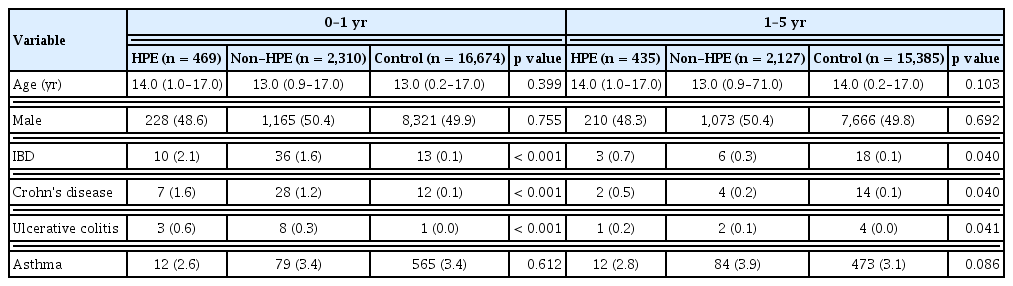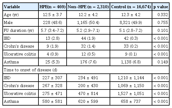 The baseline characteristics of the patients are shown in Table 1. In the HPE group, the average age was 12.5 ± 3.7 years and 48.6% (n = 228) of the patients were male. In the non-HPE group, the average age was 12.2 ± 4.2 years, and 50.4% (n = 1,165) were male. In the control group, the average age was 12.3 ± 4.2 years, and 49.9% (n = 8,321) were male. The median follow-up duration was 5.7, 5.2, and 5.1 years in the HPE, non-HPE, and control groups, respectively (Table 1).