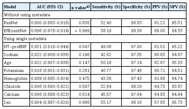 Using ECG data alone, EfficientNet B3 and ResNet-101 achieved area under the curve (AUC) values of 0.896 and 0.900, respectively, in the detection of HFrEF. In both cases, specificity was high, while sensitivity was relatively low (Table 2). A scatter plot (Fig. 5) indicated that EfficientNet B3 had a slightly higher R2 value than ResNet-101, though the overall performance of both models was comparable. When training EfficientNet B3 using ECG data combined with single metadata, the addition of NT-proBNP resulted in the best performance with an AUC of 0.931 (R2 = 0.493, p = 0.047), indicating a statistically significant improvement.