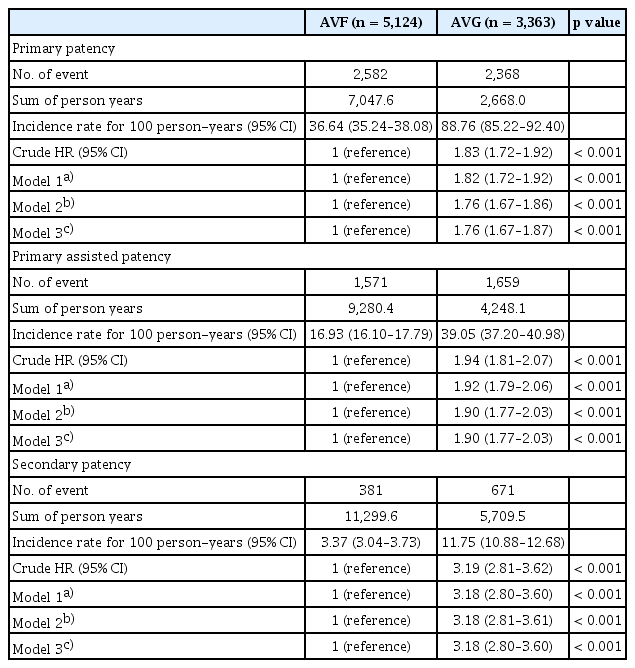 Among 8,487 patients, 5,124 (60.4%) received AVFs (AVF group) and 3,363 (39.6%) received AVGs (AVG group). AVFs were associated with significantly lower rates of patency loss across all definitions. The adjusted hazard ratios (HRs) for AVG vs. AVF were 1.76 (95% confidence interval [CI], 1.67–1.86) for primary patency loss, 1.90 (95% CI, 1.77–2.03) for assisted primary, and 3.18 (95% CI, 2.81–3.61) for secondary patency loss. All-cause mortality was also higher in the AVG group (adjusted HR, 1.24; 95% CI, 1.17–1.30).