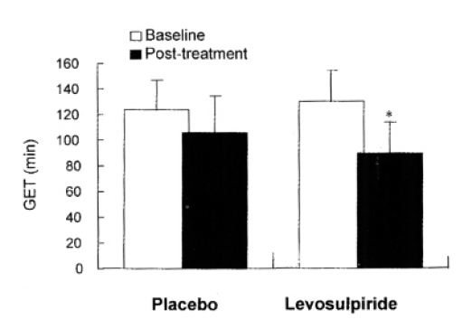 Levosulpiride 25mg t.i.d. or placebo were administered to 42 patients having functional dyspepsia with delayed gastric emptying for 3 weeks, randomly. In each subject, the study medication was taken before the three main meals. Concomitant use of antacids, antispasmodics or other antidyspeptic drugs was prohibited during the study.