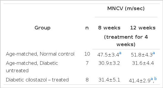 As shown in Table 2, significant reduction in MNCVs were observed in diabetic rats compared to those in age-matched normal rats at the 8th and 12th weeks after STZ treatment (p<0.001). Cilostazol treatment significantly increased MNCV in the sciatic nerves of diabetic rats but they were not restored to the levels noted in age-matched normal control rats.