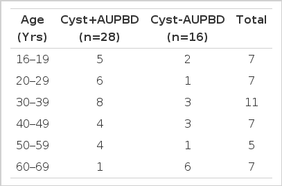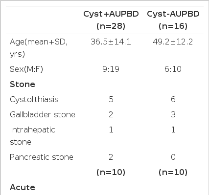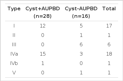 Of the 44 choledochal cyst cases, 17 cases had type I cysts, 1 had type II, 6 had type III, 18 had type IVa, 1 had type IVb, and 1 had type V. The AUPBD-present group was 28 (64%), while the AUPBD-absent group was 16 (36%). AUPBD was observed only in type I and IV patients, whereas it was not shown in type II, III, V patients (Table 1). Age distribution of choledochal cyst was 7 in 16–19 years, 7 in 20–29 years, 11 in 30–39 years, 7 in 40–49 years, 5 in 50–59 years and 7 in 60–69 years (Table 2). There were 15 males and 29 females (M:F ratio, 1:1.9).