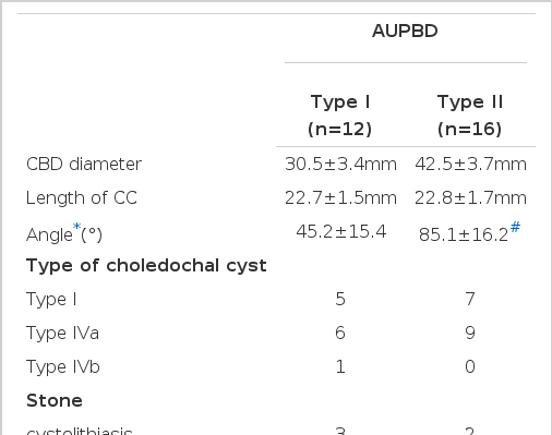 While most of the choledochal cysts were observed in infants, it can also be found in adults5). All of our cases had choledochal cyst diagnosed in adulthood and the presence or absence of AUPBD was confirmed by endoscopic retrograde cholangiopancreatography (ERCP). The number of the cases was 44, the largest series having been collected from a single institution, except the ones from Japan. Moreover, there were rare reports in English literature which compared clinical features of choledochal cyst according to the presence of AUPBD. The purpose of our study was to compare the clinical characteristics of 44 cases with adulthood choledochal cyst according to the presence or absence of AUPBD. Furthermore, we tried to clarify the significance of AUPBD in patients with choledochal cyst.