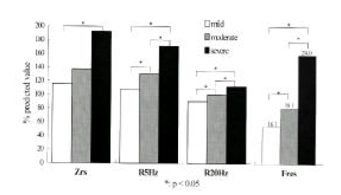 216 patients with asthma were enrolled in this study. Patients were classified into 3 different groups according to their symptoms and pulmonary functions. Respiratory impedance, resistance (at 5 Hz, 20 Hz, 35 Hz) and resonant frequency were measured by FOT. FEV1, FVC and MMEF were measured with conventional spirometry.