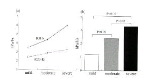 Resonant frequency, resistance at 5 Hz and 20 Hz showed significant difference between each group (p<0.05) (Table 2). There were significant higher values of impedance in the severe asthma group than in the mild (p<0.05). Resistance at 35 Hz had a tendency to increase as severity increased, but statistical significance was not found (p>0.05) (Figure 1). In contrast to the relative constancy of resistance at different frequencies in healthy subjects, resistance is increased at the lower applied frequencies but falls with increasing frequencies in patients with intrapulmonary airway obstruction13). This reflects the presence of inhomogeneity of pulmonary mechanical properties. Based on this point, we calculated resistance difference at 5 Hz and 20 Hz (R5Hz–R20Hz) as a parameter of airway obstruction. This parameter showed statistically significant difference between each asthma group (p<0.05) (Figure 2).