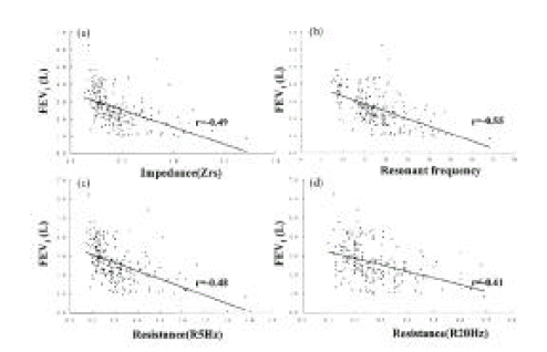 Correlation between FEV1 and impedance (a), resonant frequency (b), resistance at 5 Hz (c), and resistance at 20 Hz (d). Each correlation shows statistically significant relationship (p<0.05).