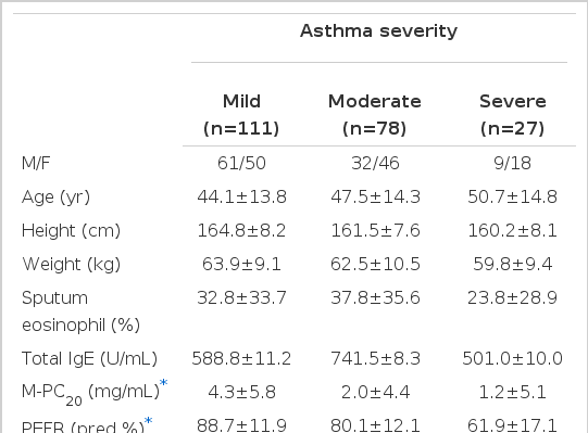 Table 1 shows the clinical and laboratory characteristics of patients according to asthma severity. There was no significant difference in age, height, weight, serum IgE and sputum eosinophil counts between each group. Airway hyperresponsiveness was significantly increased along with asthma severity, and lung functions measured by spirometry showed significant difference between each group.