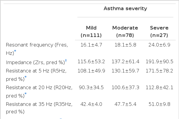 In this study, we tried to estimate the clinical usefulness of FOT in the classification of asthma severity. We did not differentiate patients with mild intermittent asthma from mild persistent asthma, because both groups showed the same range of spirometry measurements, and FOT could not classify mild asthma into two distinct groups in our unpublished data. We also included smokers in this study, because FOT difference between smokers and non-smokers was not found in our analysis (data not shown) and in a previous report by Landser et al.17).