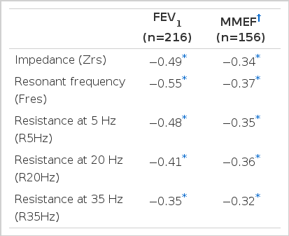 Resonant frequency measured by FOT and FEV1 by spirometry showed good inverse correlation (r=−0.55, p<0.01). Comparison of Zrs, R5Hz and R20Hz with FEV1 also showed significant correlation (p<0.05, respectively) (Figure 3). Relationships between FOT parameters and MMEF in 156 patients with FEV1 more than 80% of predicted value were still significant, but slightly lower compared with associations between FOT parameters and FEV1 (Table 3).