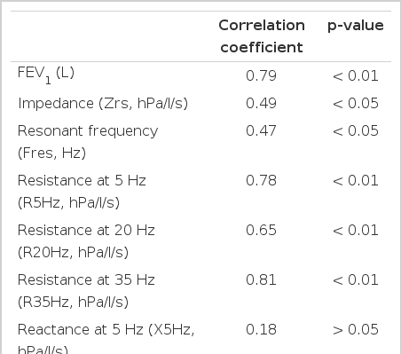 We estimated reproducibility of FOT and spirometry measurements by comparison of the same parameters of repeated tests which were performed two times separately (mean interval; 6 months) in patients with no severity changes. Correlation of FEV1 between two measurements was 0.79 and similar to that of R5Hz (r=0.78). Zrs, resonant frequency, R20Hz and R35Hz also showed significant reproducibility, respectively (Table 4).