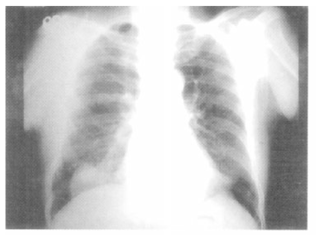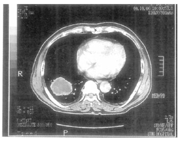 On presentation, the patient appeared to be in no distress, relatively. His blood pressure was 110/70 mmHg; heart rate 78 beats /min; respiratory rate 23 breaths /min; body temperature 37.60°C. Examination of the lung revealed slightly reduced breath sounds over the right lower lung. Cardiac examination revealed a regular rhythm without murmurs. Findings of the abdominal examination were normal and the extremities were without clubbing, cyanosis or edema.