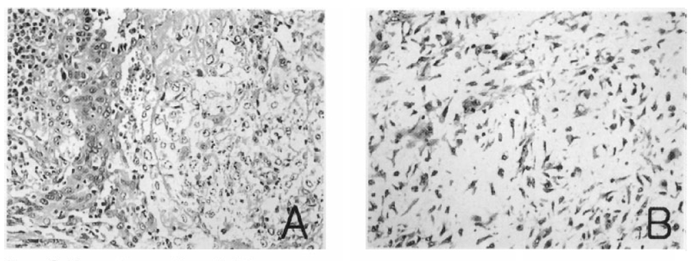 Microscopic views. The epithelial component shows poorly differentiated squamous cell carcinoma (A) and the mesenchymal component shows chondrosarcoma (B). (H & E stain, × 400)