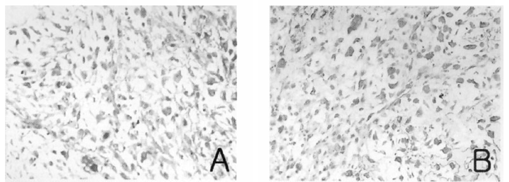 Immunohistochemical stainings. The poorly differentiated squamous cell carcinoma shows focal positive for epithelial membrane antigen (A). The chondrosarcoma shows positive for vimentin (B). (× 400)